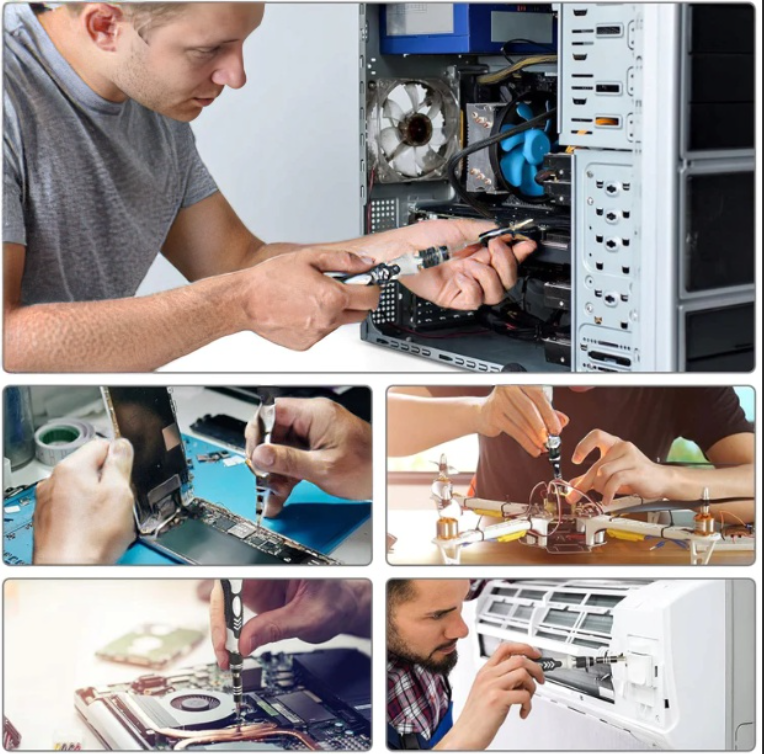 Świetnie sprawdzi się przy precyzyjnych naprawach elektroniki: telefonów, tabletów, laptopów, aparatów fotograficznych, zegarków, a także sprzętu RTV i AGD z nietypowymi śrubkami.